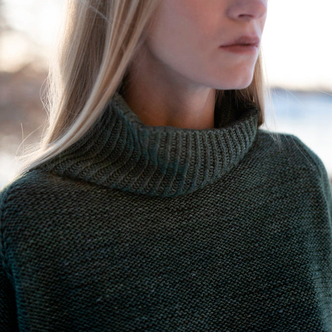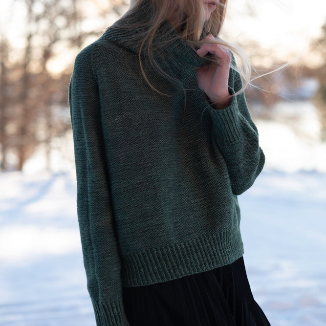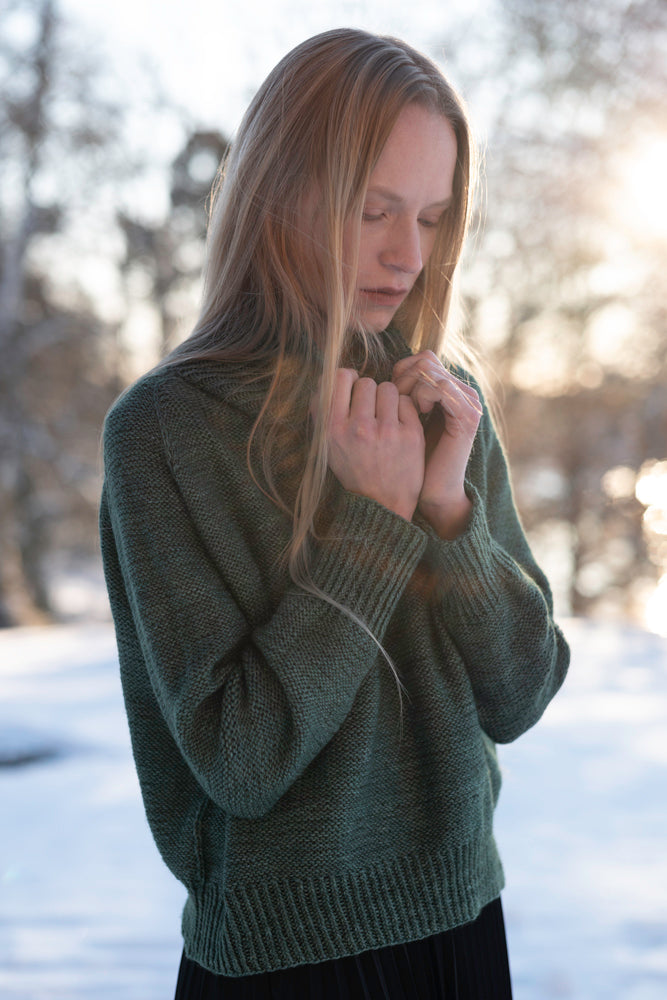En klassisk genser i en nydelig miks i silkegarn. Deilig mot huden og med en klassisk finish. Denne genseren er strikket ovenfra og ned, i glattstrikk, og skal så vrenges for å oppnå den vrangstrikkede effekten. Halsen er dobbel for å gi ekstra hold og varme. Den lett og ledig, og har en oversized passform på bol, og mer ettersittende ermer.