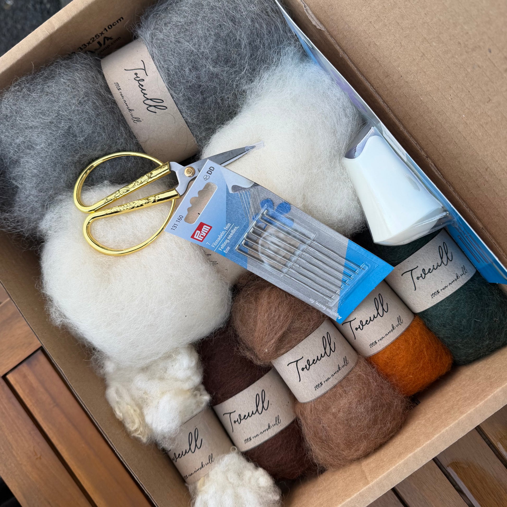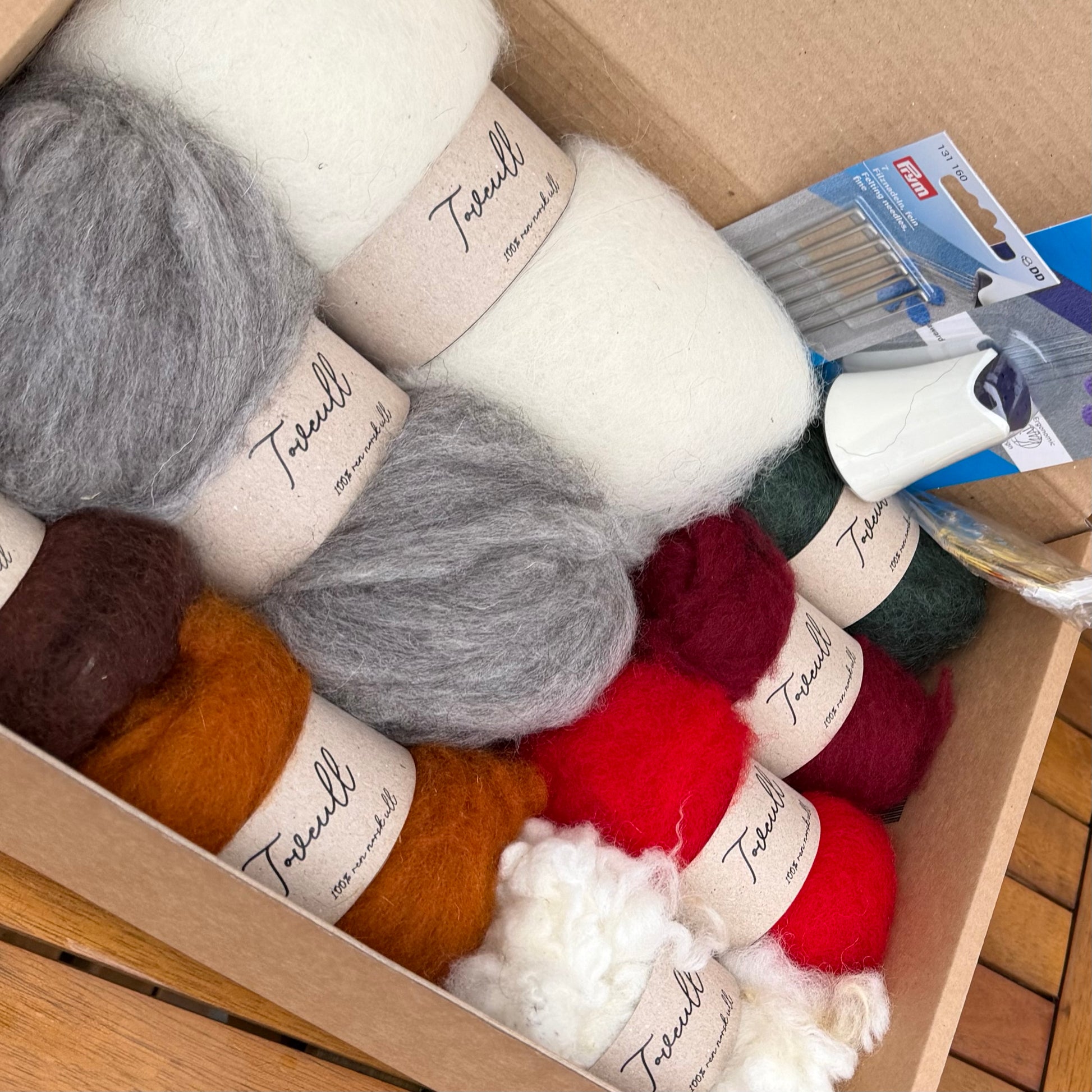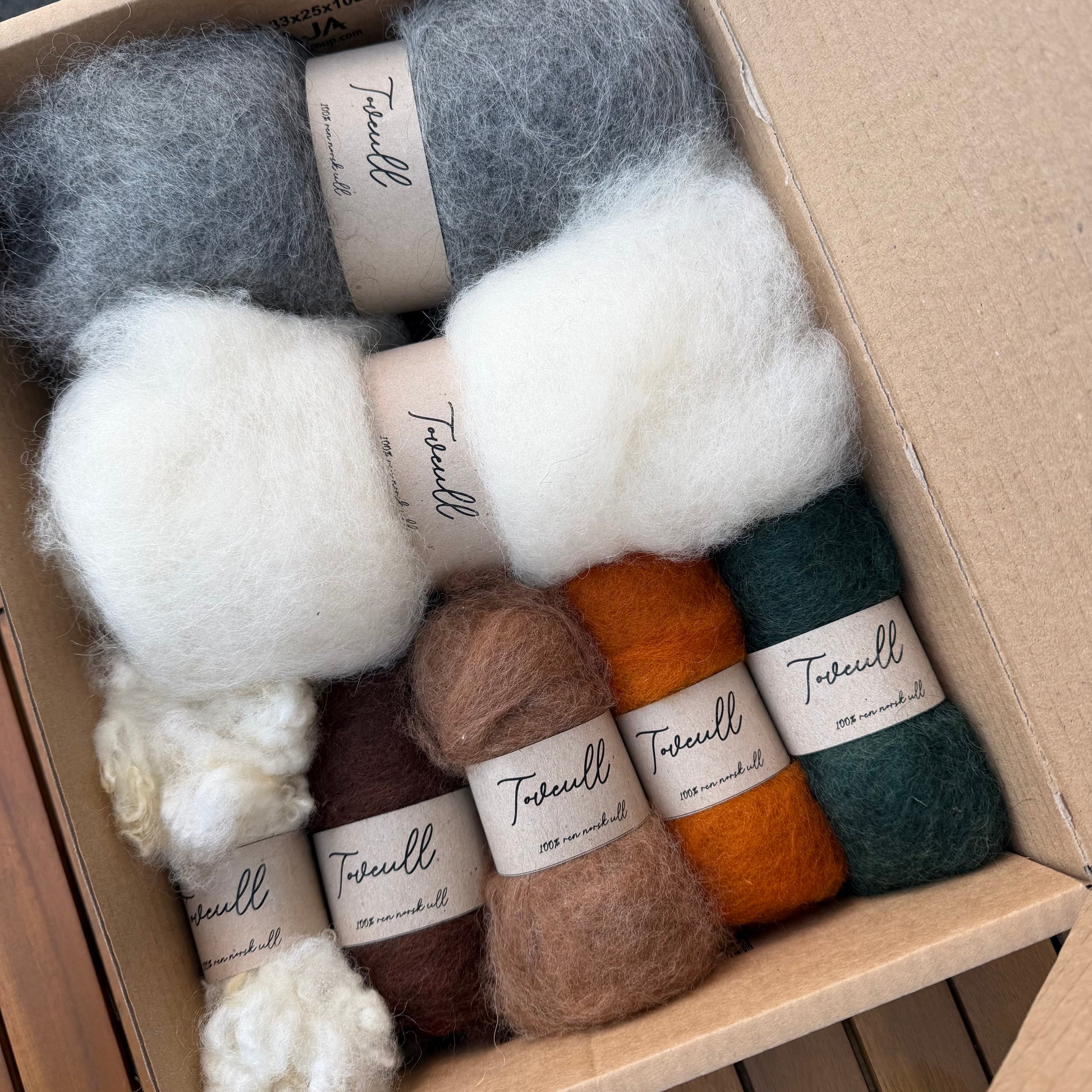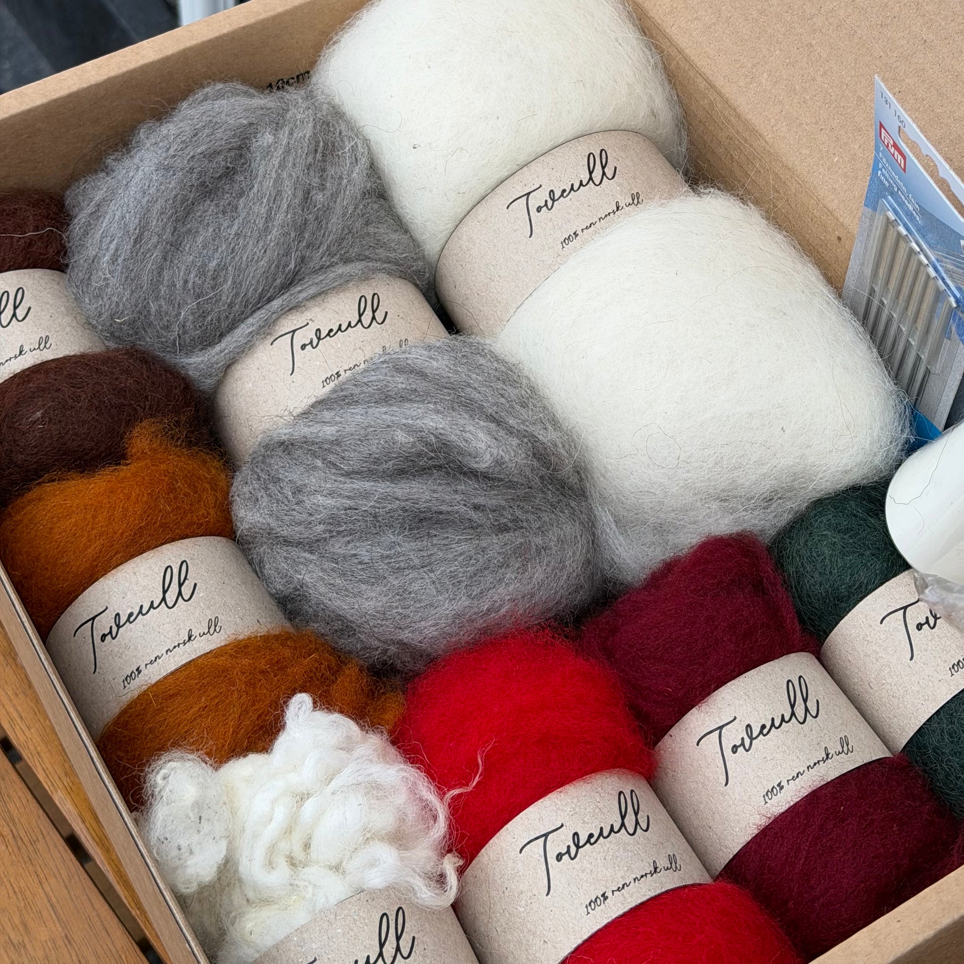 Dette er et nydelig sett med ull i forskjellige fargekombinasjoner + naturlig farget ull. Her kan du lage julepynt, påskepynt eller små vindusdekorasjoner! Vi har lagt ved en oppskrift, men også veiledning på hvor du kan finne gode videoer og oppskrifter på toving.